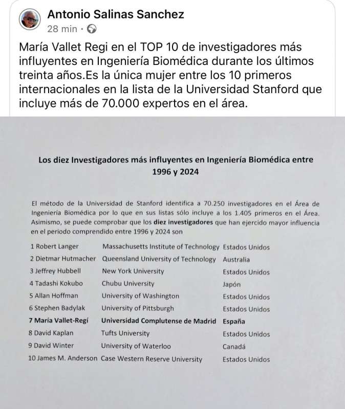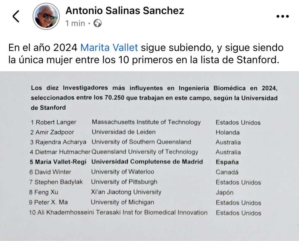 María Vallet-Regí, the only woman in the top 10 on the Stanford list